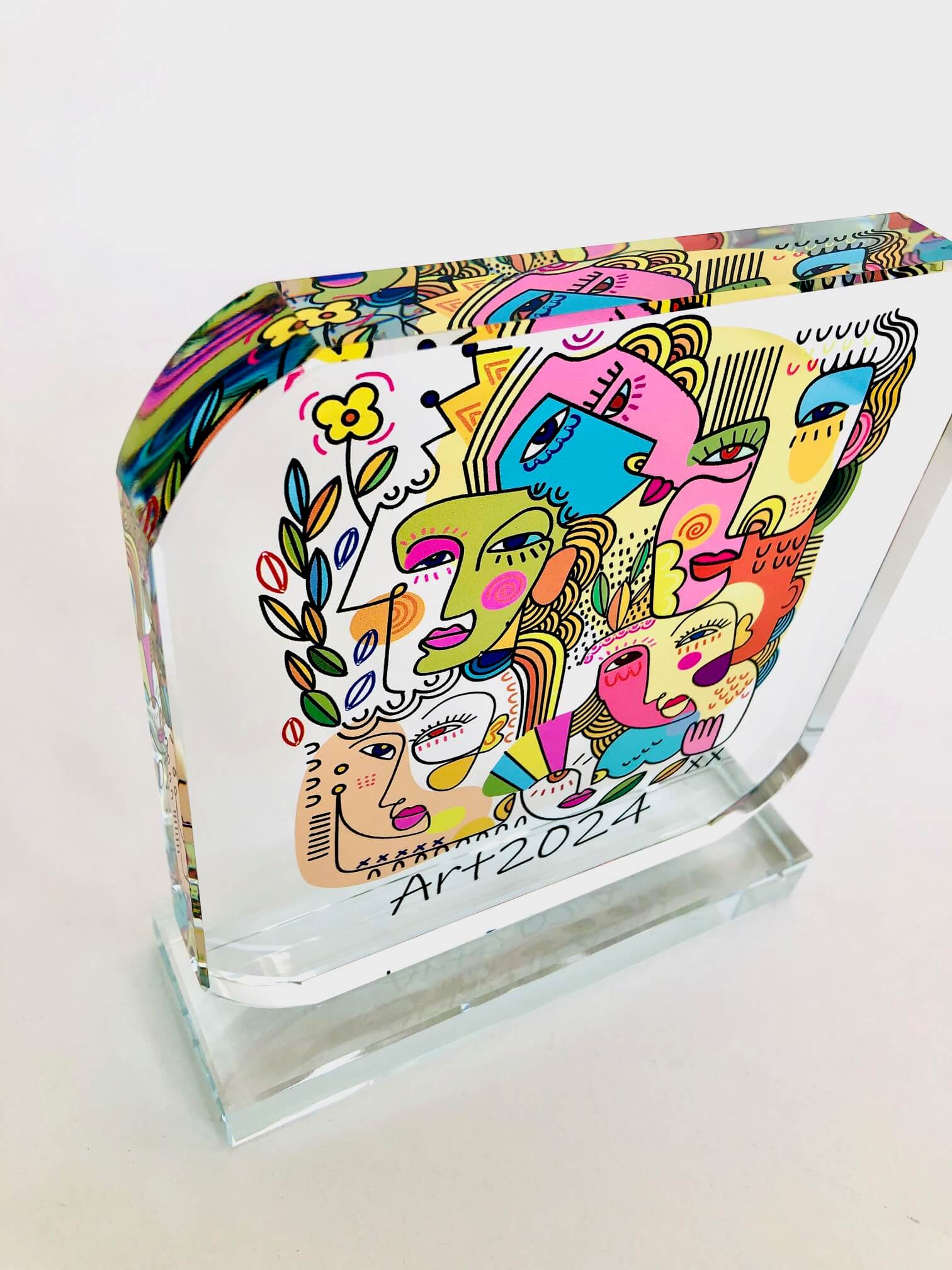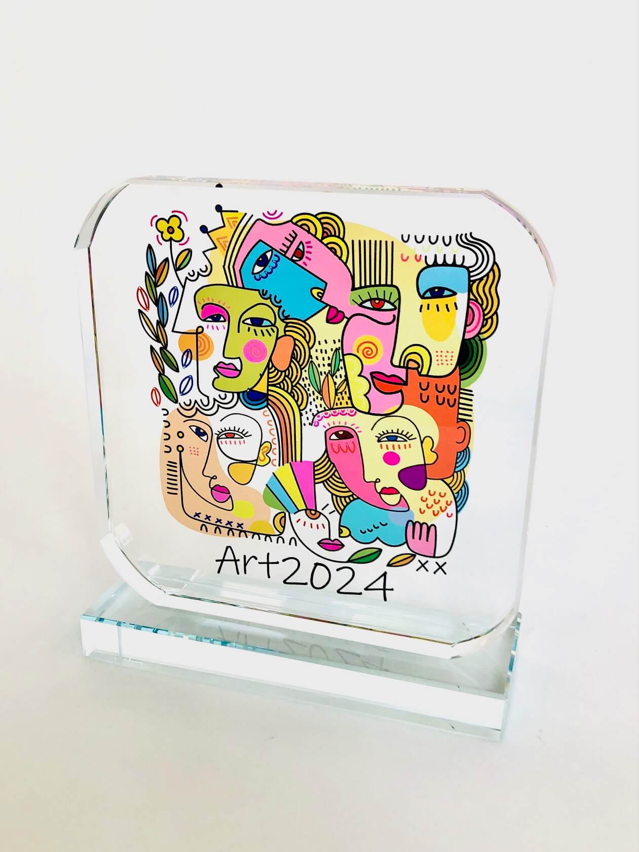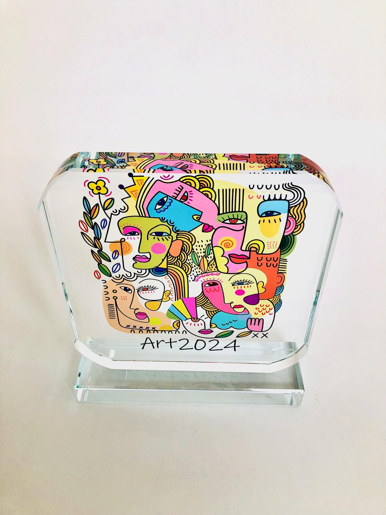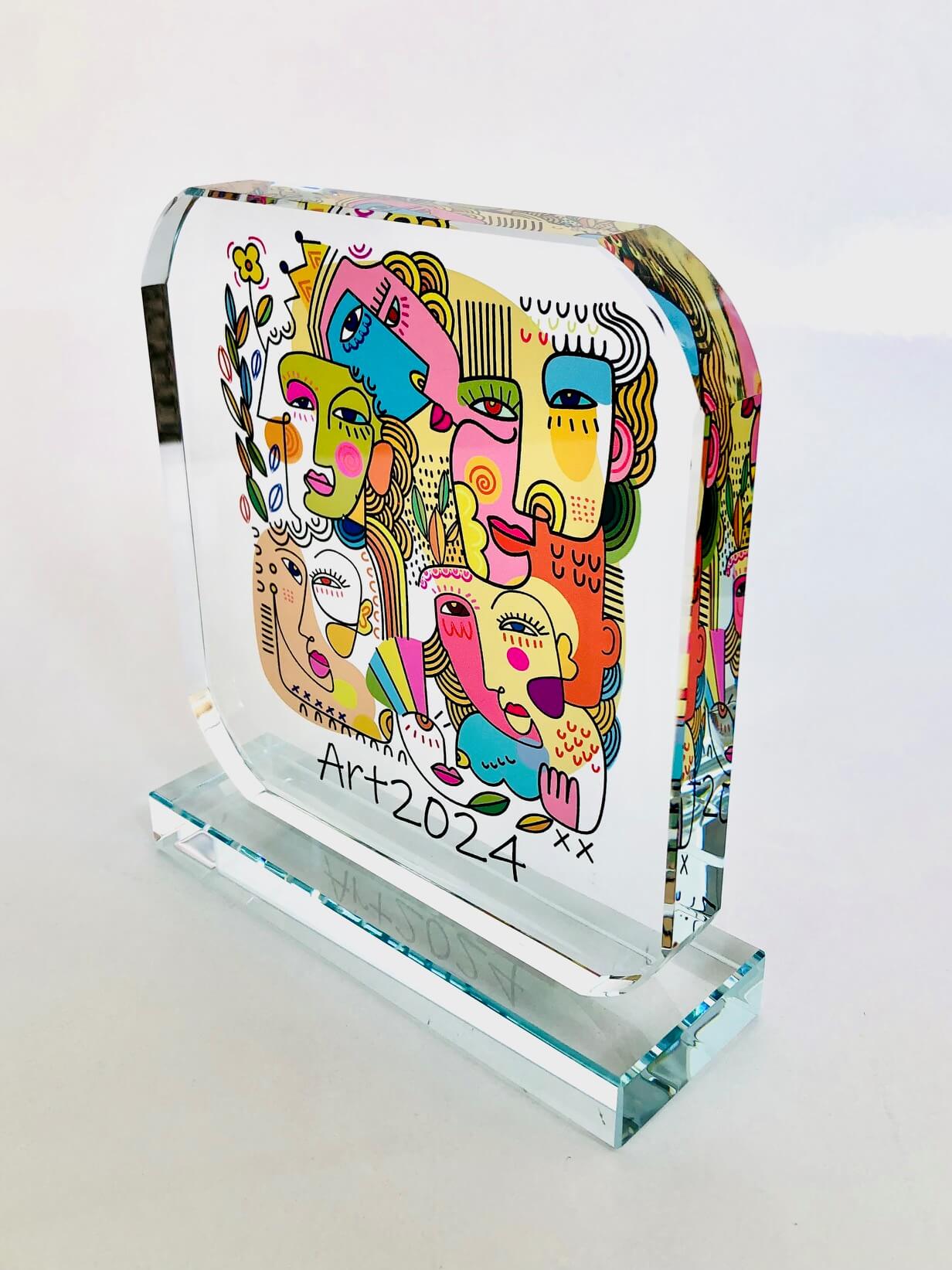 Premio de cristal óptico de 2cm grosor transparente forma esquinas redondeadas para personalizar con impresión digital a color con el diseño de su evento, logos, textos, diseños, etc.