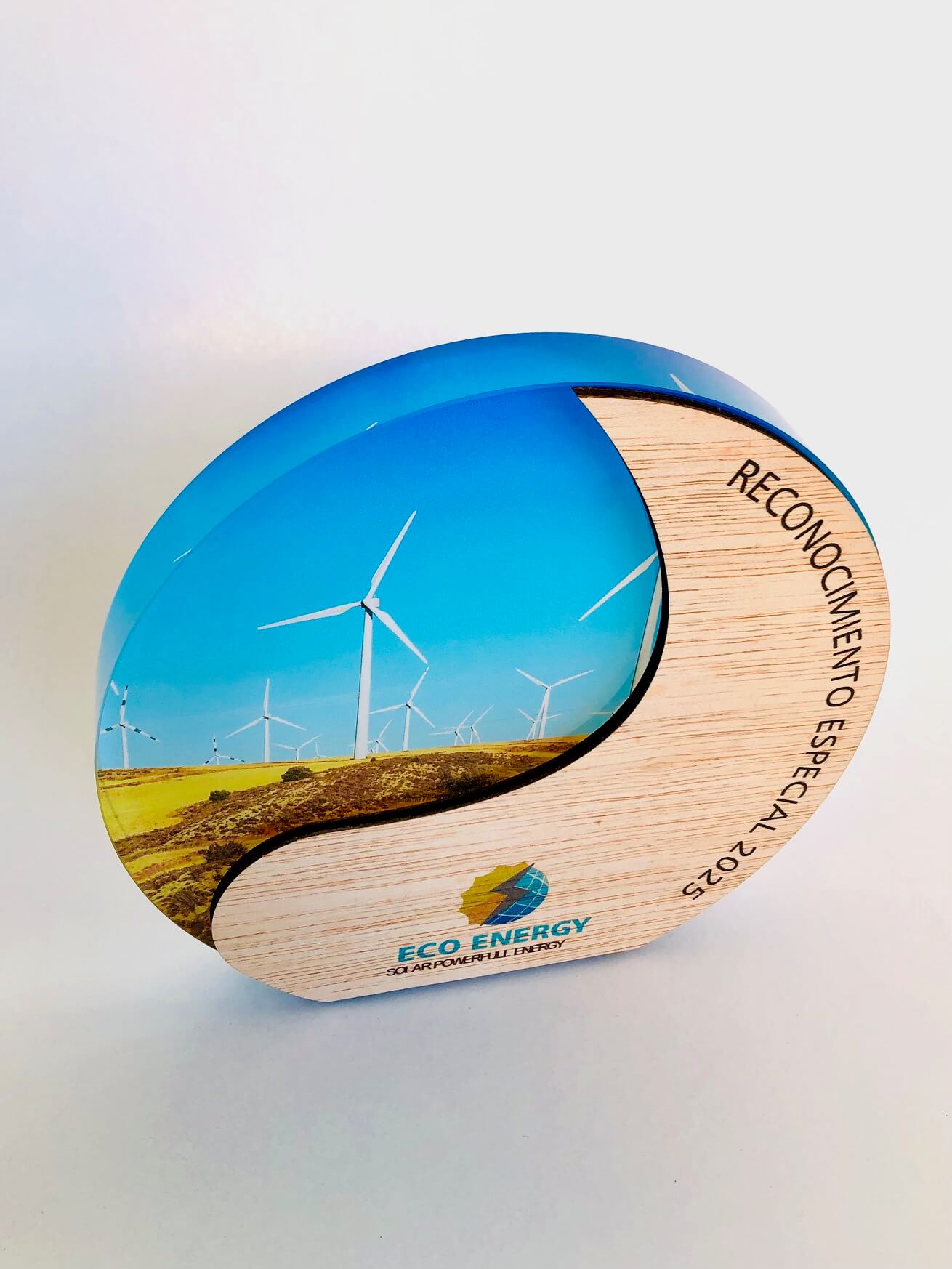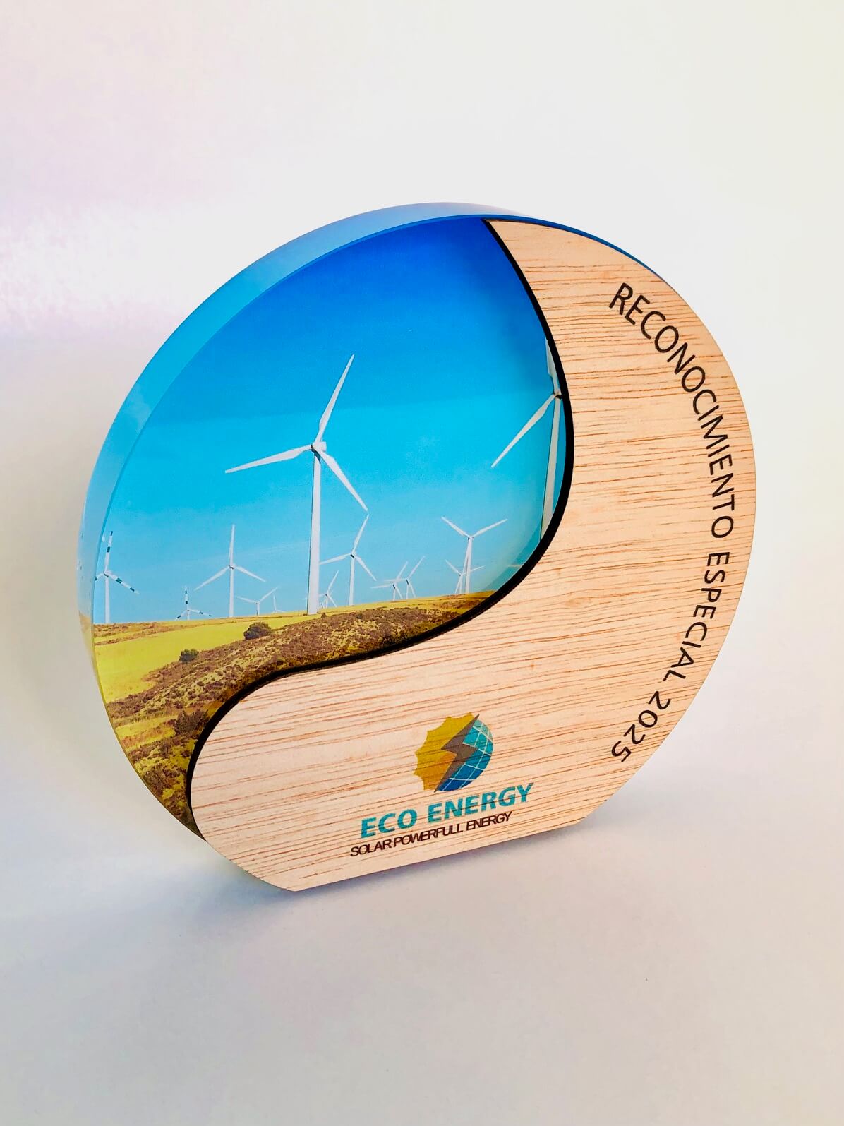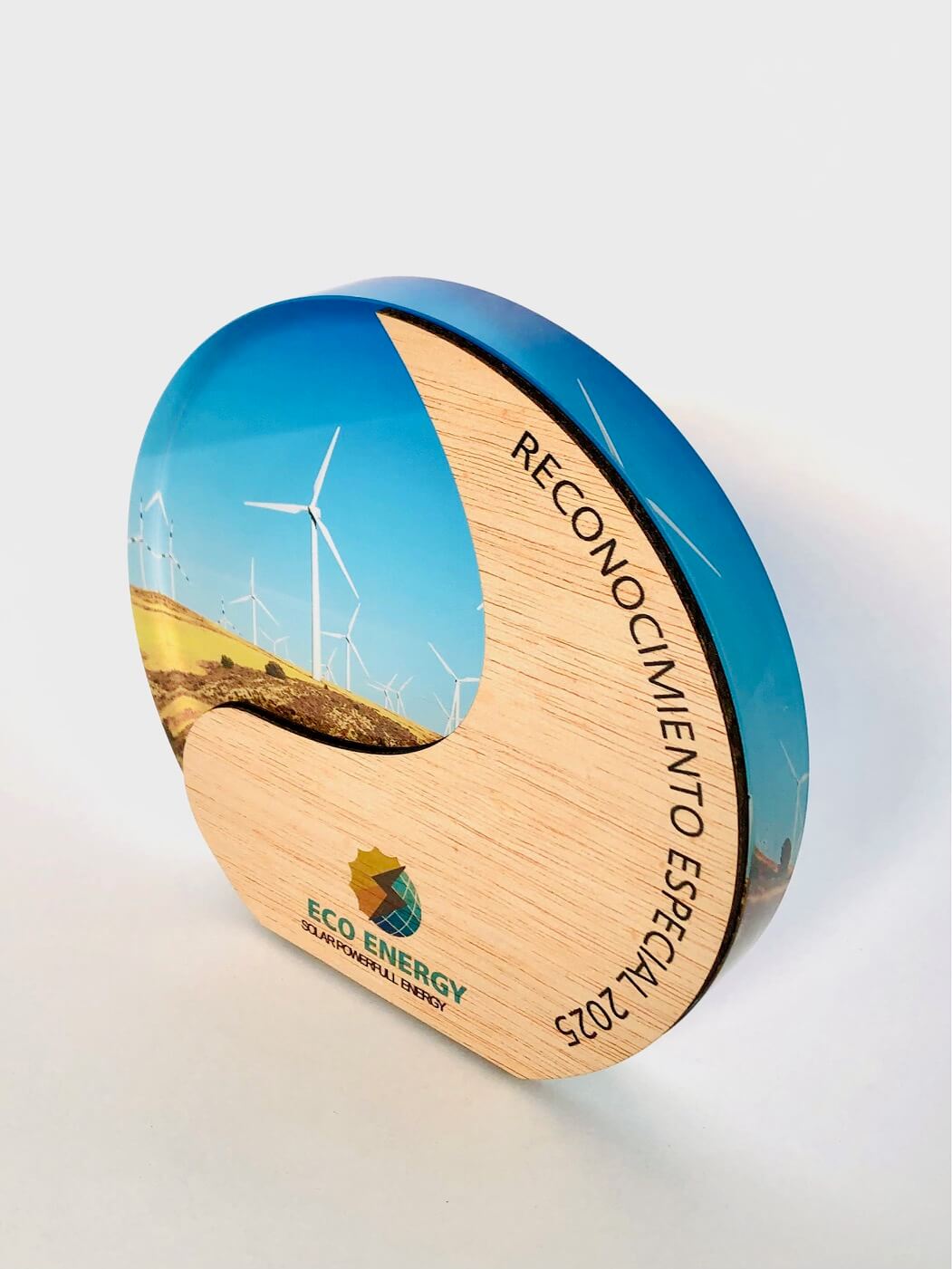 Premio de cristal óptico transparente con forma redonda y base plana para personalizar con impresión digital a color con el diseño de su evento, logos, textos, diseños, etc. Doble capa de madera ecológica sostenible ideal para destacar el texto del premiado.
