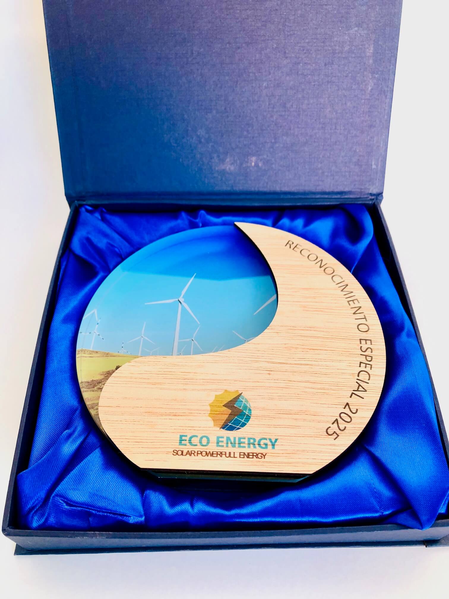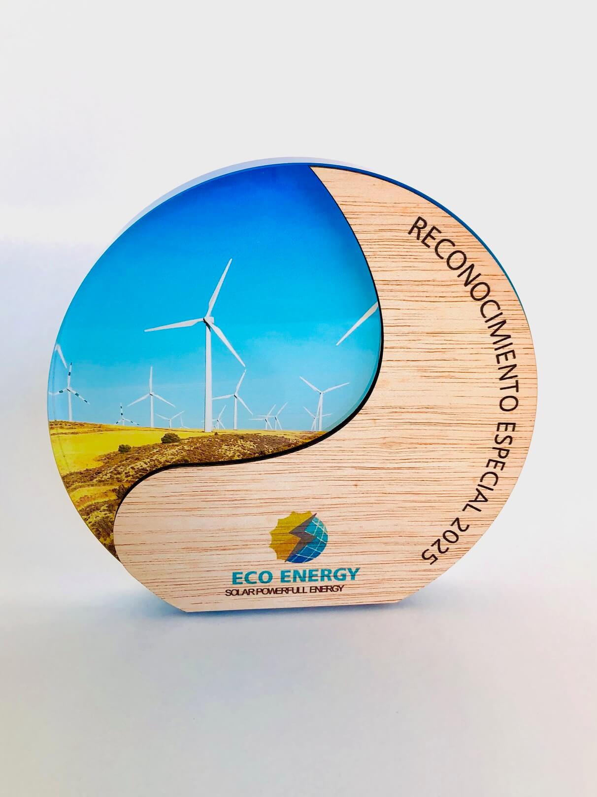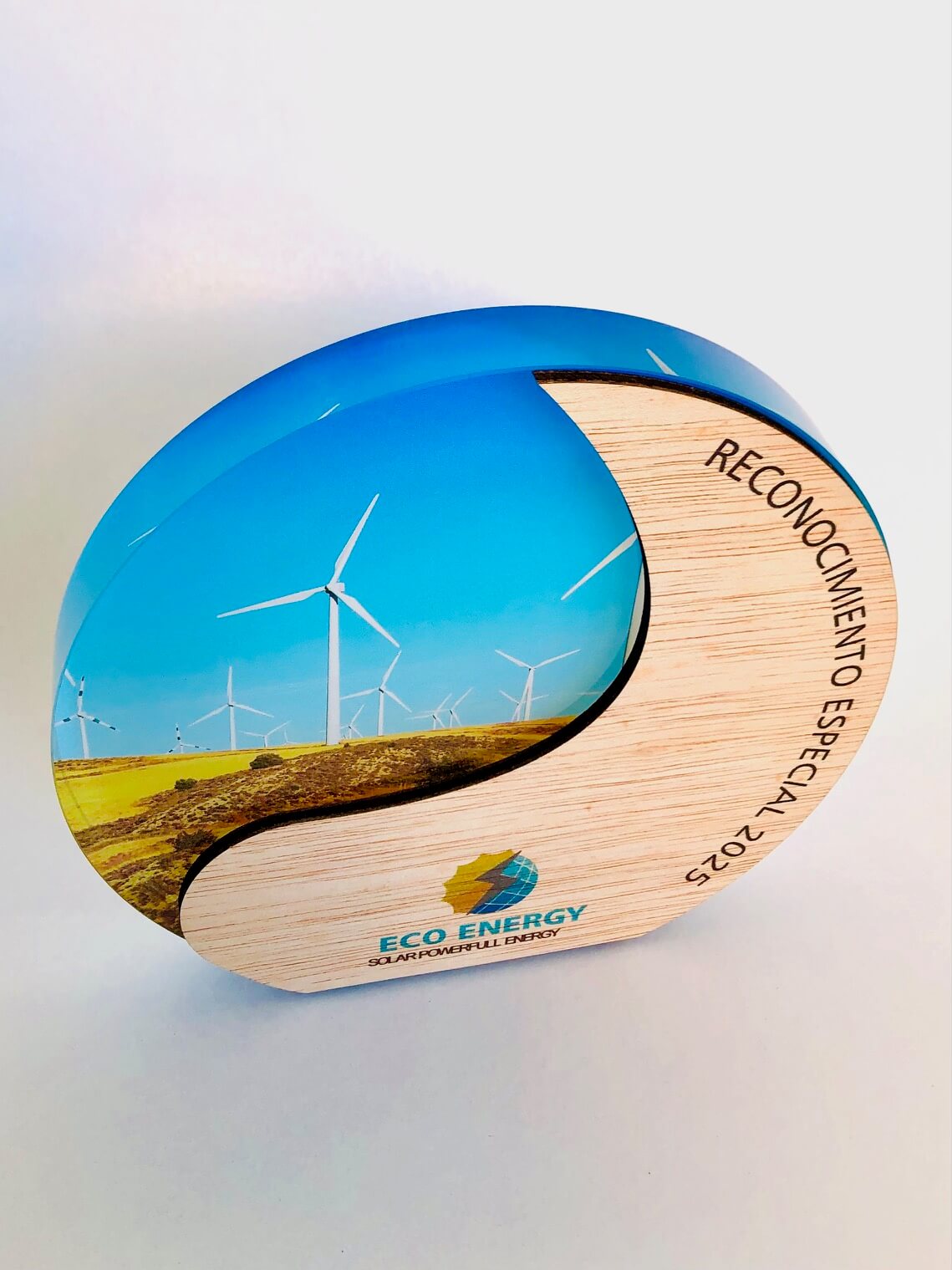 Premio de cristal óptico transparente con forma redonda y base plana para personalizar con impresión digital a color con el diseño de su evento, logos, textos, diseños, etc. Doble capa de madera ecológica sostenible ideal para destacar el texto del premiado.