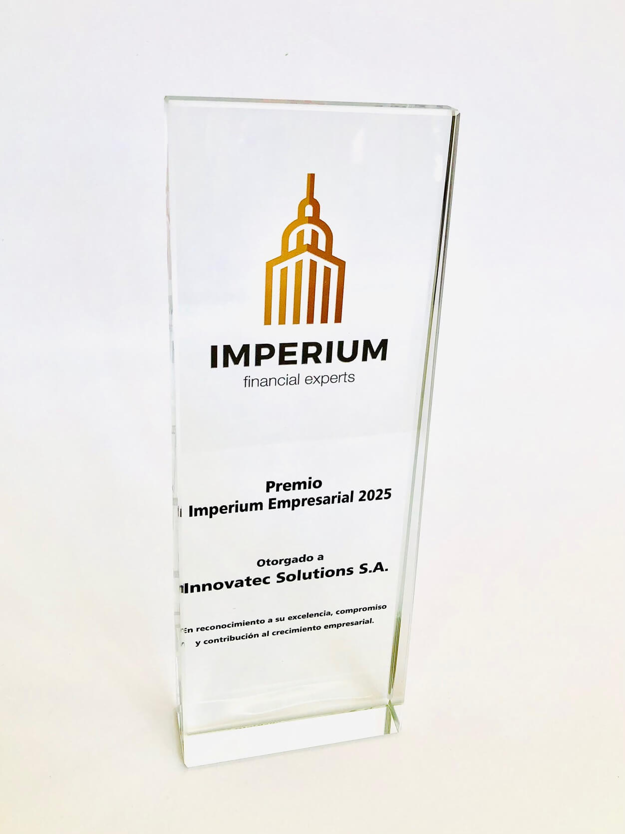 Premio de cristal óptico de 8cm de ancho y 3cm grueso para personalizar a color con logotipos. textos, diseños, nombres individuales, etc. Presentado en caja de cartón individual con posibilidad de incluir logos a color. Disponible en 3 medidas:
