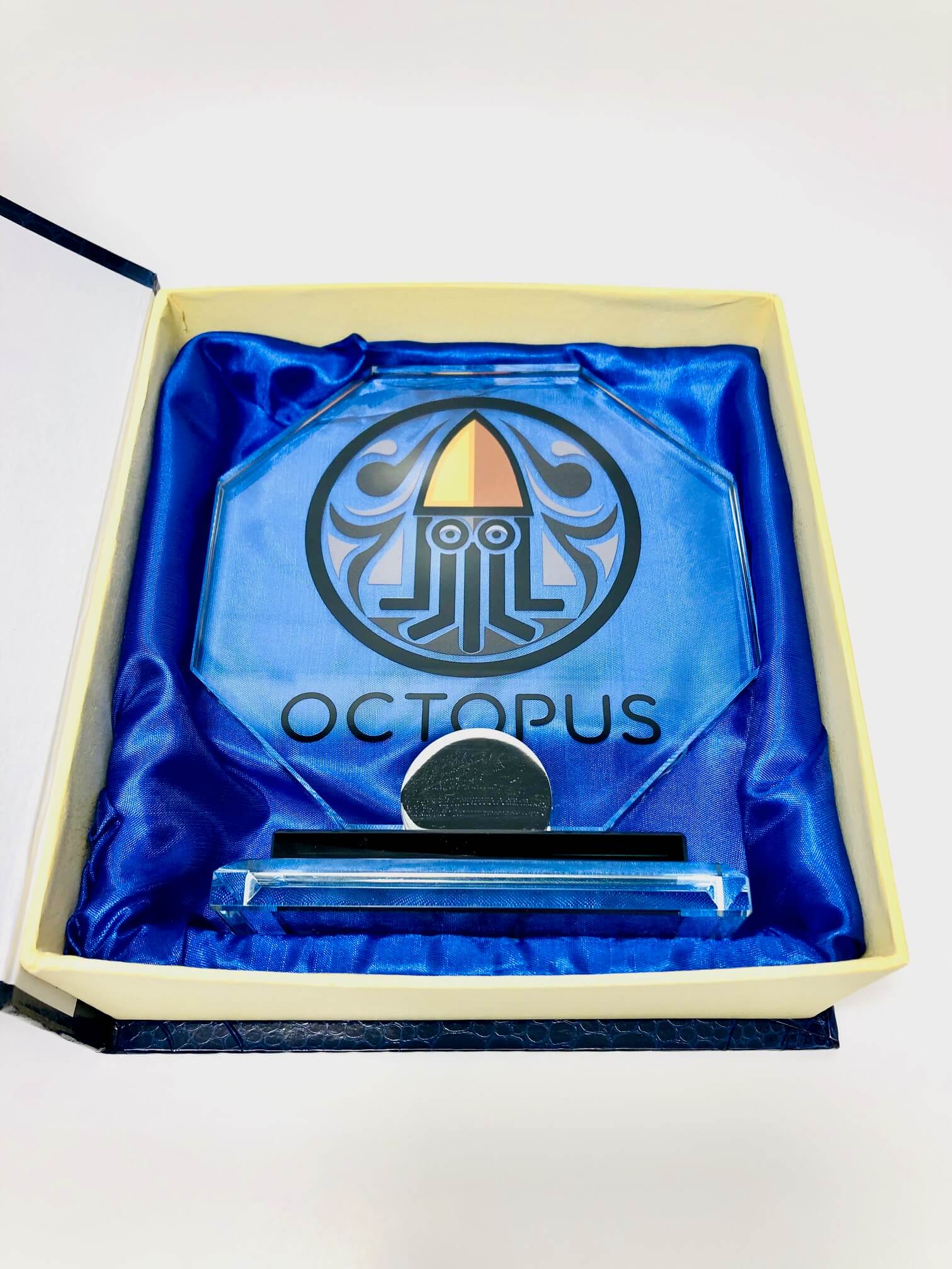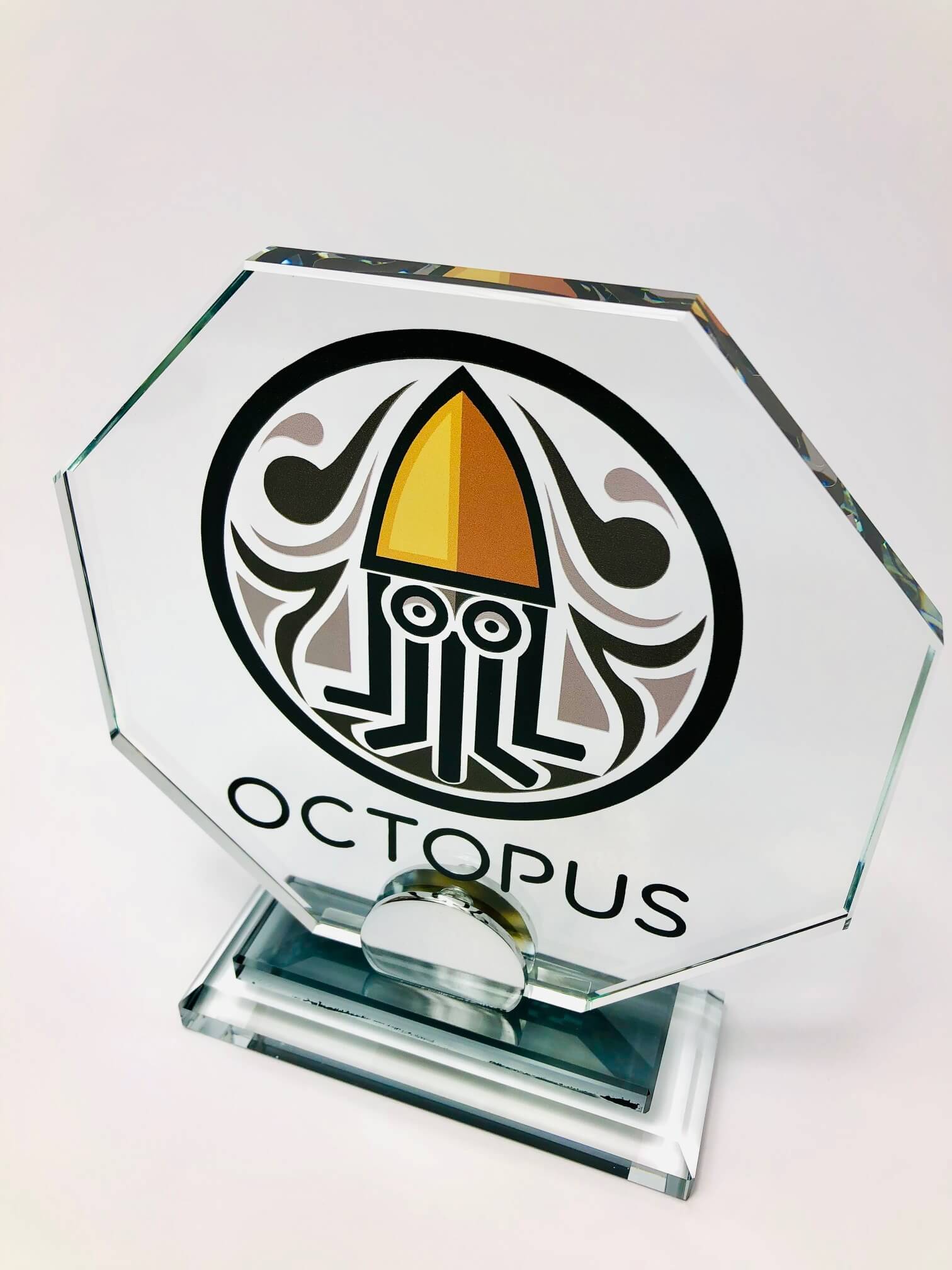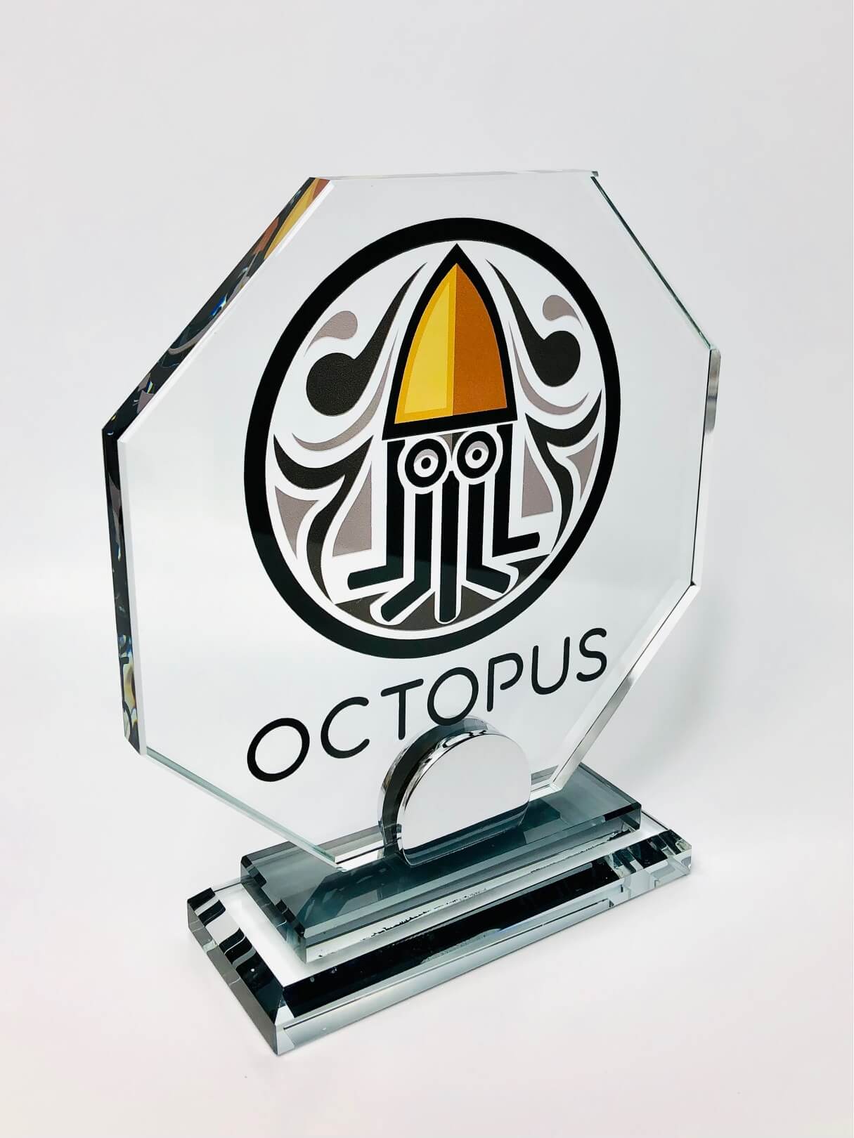 Premio octogonal de cristal óptico de 1cm. de grueso para personalizar a color con logotipos. textos, diseños, nombres individuales, etc. Presentado en caja de cartón individual con posibilidad de incluir logos a color. Disponible en 3 medidas: