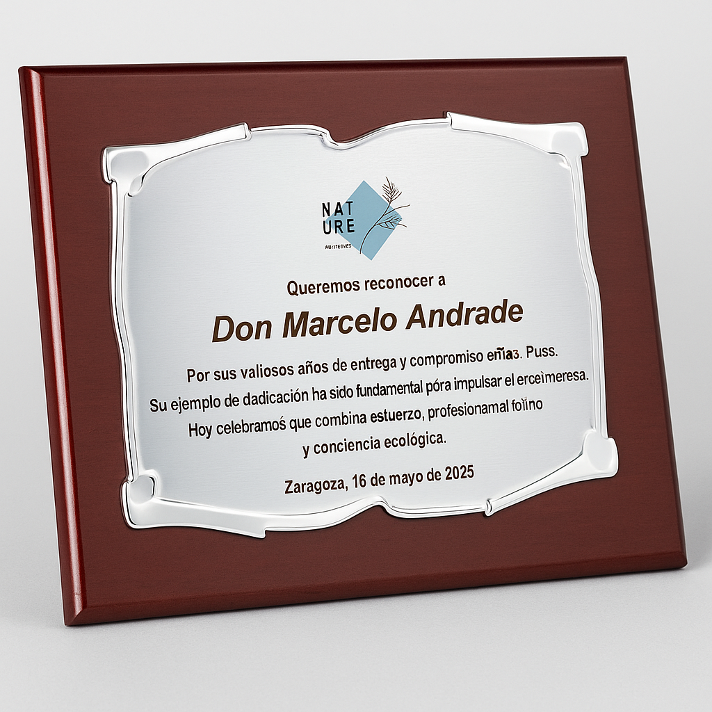 Nuestra placa de reconocimiento combina diseño moderno, detalles en madera y un acabado en plateado elegante que transmite gratitud y distinción.